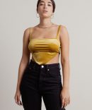 Turn heads in the DeMun Crop Top in Gold! This chic velvet crop top adds a dash of daring with its bandana-inspired design. Perfect for layering or standing out on its own, it’s all about that bold, fun flair. Embrace the trend and show off your unique style with a touch of luxe and attitude!